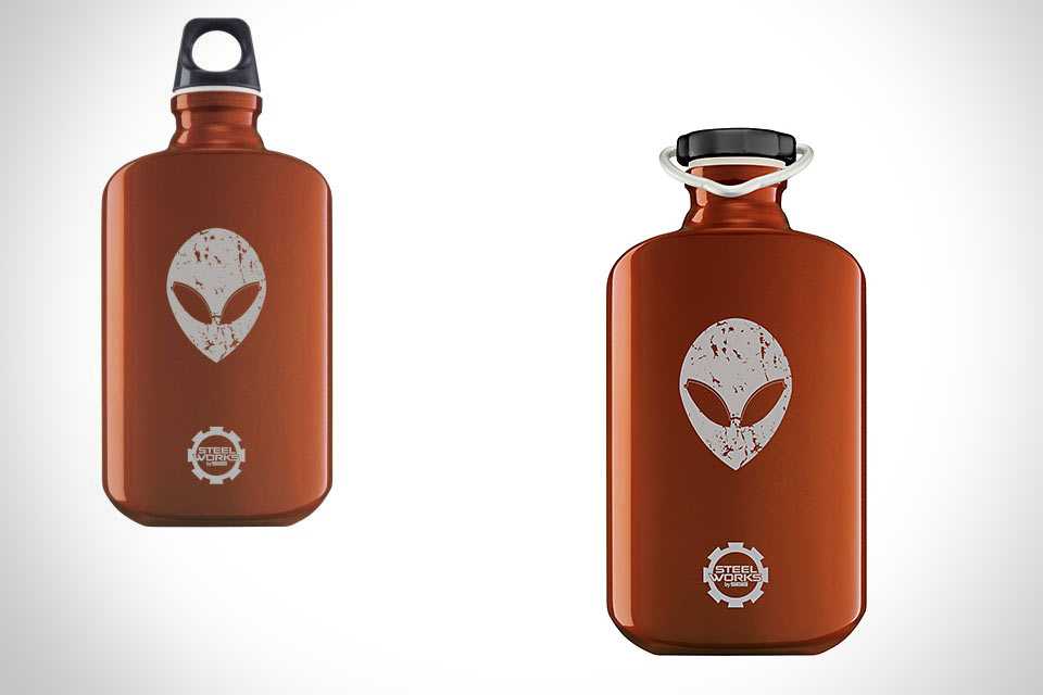 Обычно стальные фляги выпускаются для алкоголя, но существуют варианты и для воды, а также других негорючих жидкостей. Например, Sigg Steelworks Alien, которой я пользуюсь больше двух лет. Широкое горлышко, резиновый уплотнитель и металлическое кольцо сверху, за которое бутыль удобно носить, и благодаря нему емкость туго закручивается (чтобы ничего не пролилось при тряске), глянцевое и устойчивое к царапинам внешнее покрытие, плюс специальное инертное покрытие внутри. Всё сделано на высшем уровне. Аксессуар довольно увесистый, но это только в кайф. Берешь в руки, чувствуешь — вещь! Емкость фляги составляет 0,6 л.