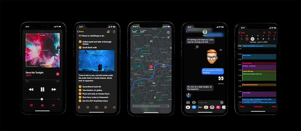 Одной из главных новых фич стал Темный Режим. Все приложения и экраны Apple теперь могут быть черными, вплоть до сообщений, клавиатуры, новостей и календаря. Это уменьшает воздействие экрана на глаза, экономит энергию, плюс «выглядит круто». В аудитории визг и овации.