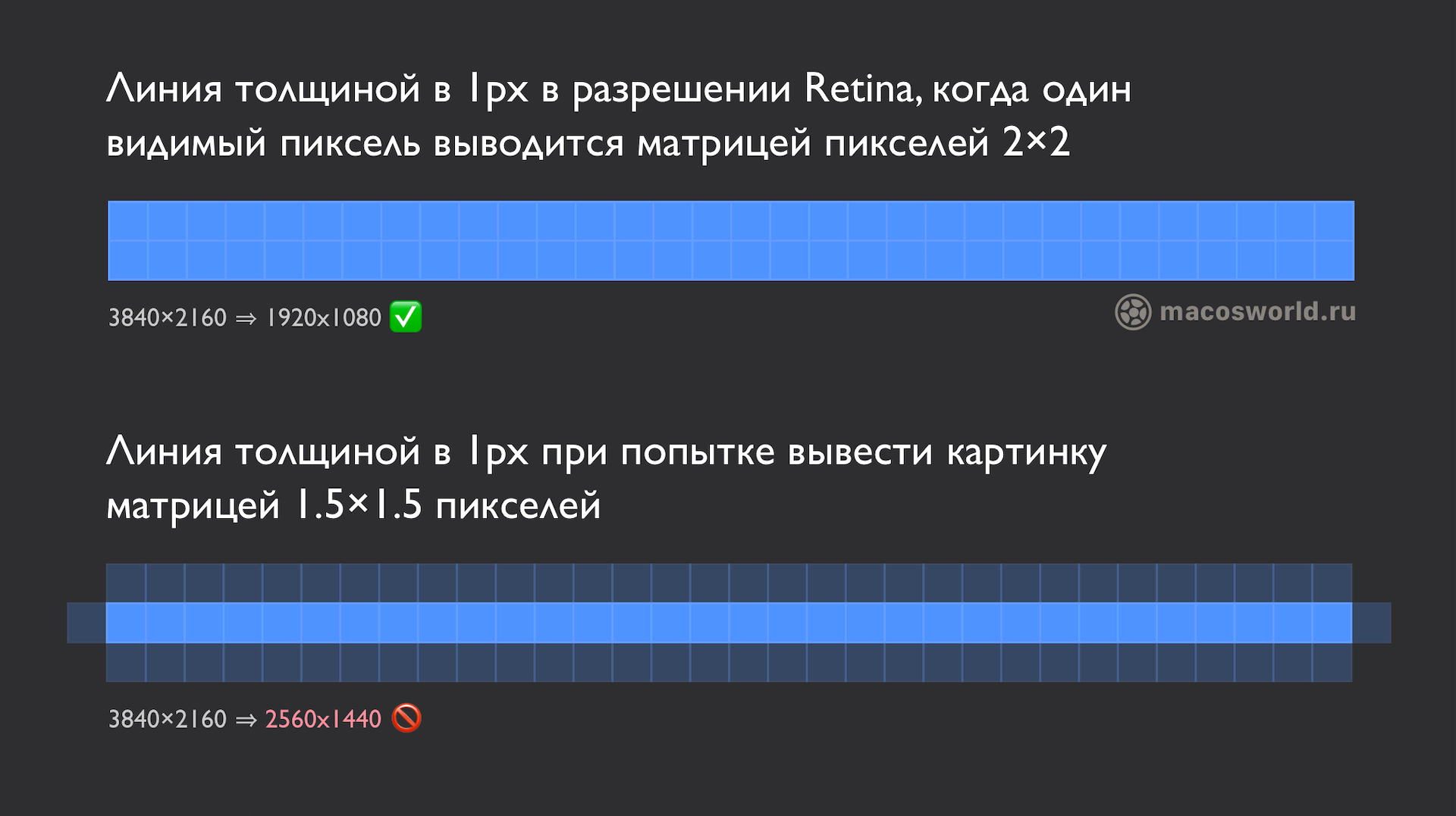 Из всей линейки компьютеров Apple только 13-дюймовый MacBook Pro делает «плохое» масштабирование, превращая родное разрешение 2560×1600 в 1440×900. Но, благодаря маленькой диагонали, пиксели настолько маленькие, что картинка всё ещё остаётся чёткой.