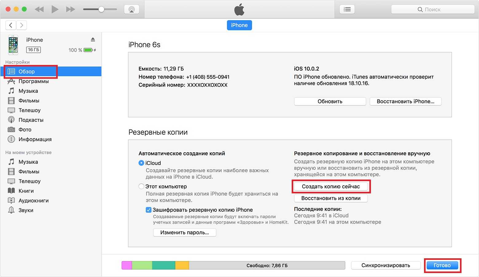 1 iTunes — подключите iPad к ПК, кликните по иконке девайса, когда он определится, далее вкладку «Обзор» и кнопку «Создать копию сейчас»