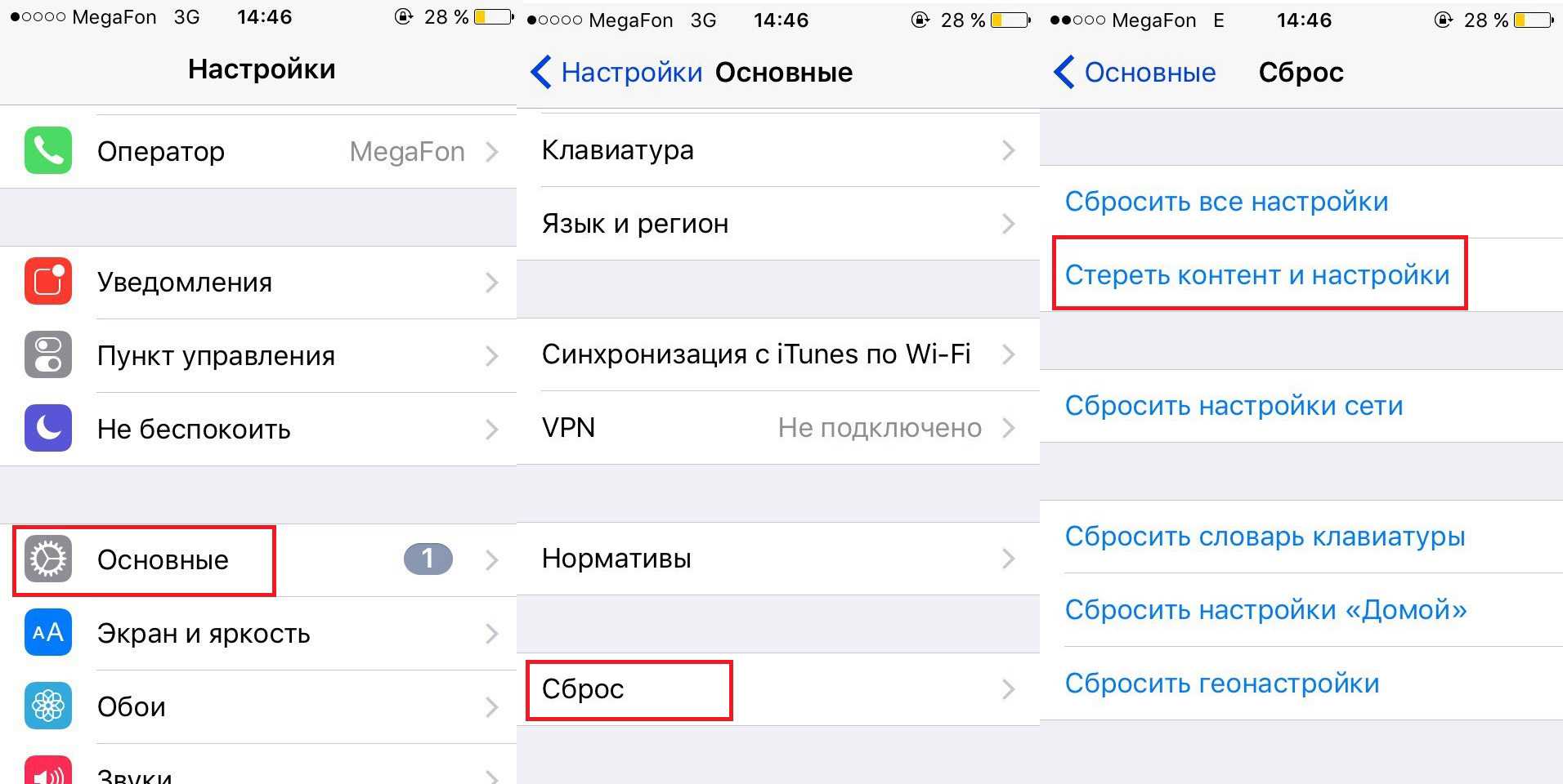 3 сам девайс — «Настройки»/»Основные»/»Сброс»/»Стереть контент и настройки»