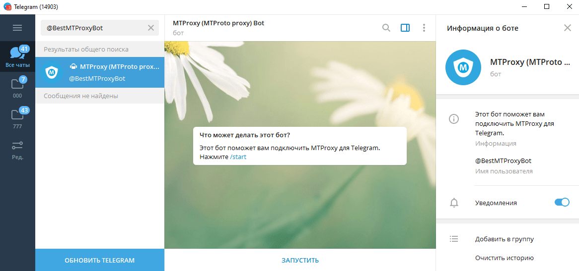 Нюанс — нужно быть подключенным к Телеграм для корректной работы. В поисковике чата пишут имя, например, @proxy_socks5_bot или @TeleBot. Затем нужно написать этому контакту слово /start и перейти по ссылке, которая придет в ответ. Другие боты: