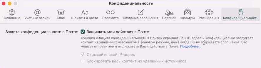 Почта. В настройках почты, вкладка Конфиденциальность — вы можете включить «Защиту моих действий по почте». Ваш IP-адрес будет скрыт, и никто не узнает, когда вы открыли сообщение.