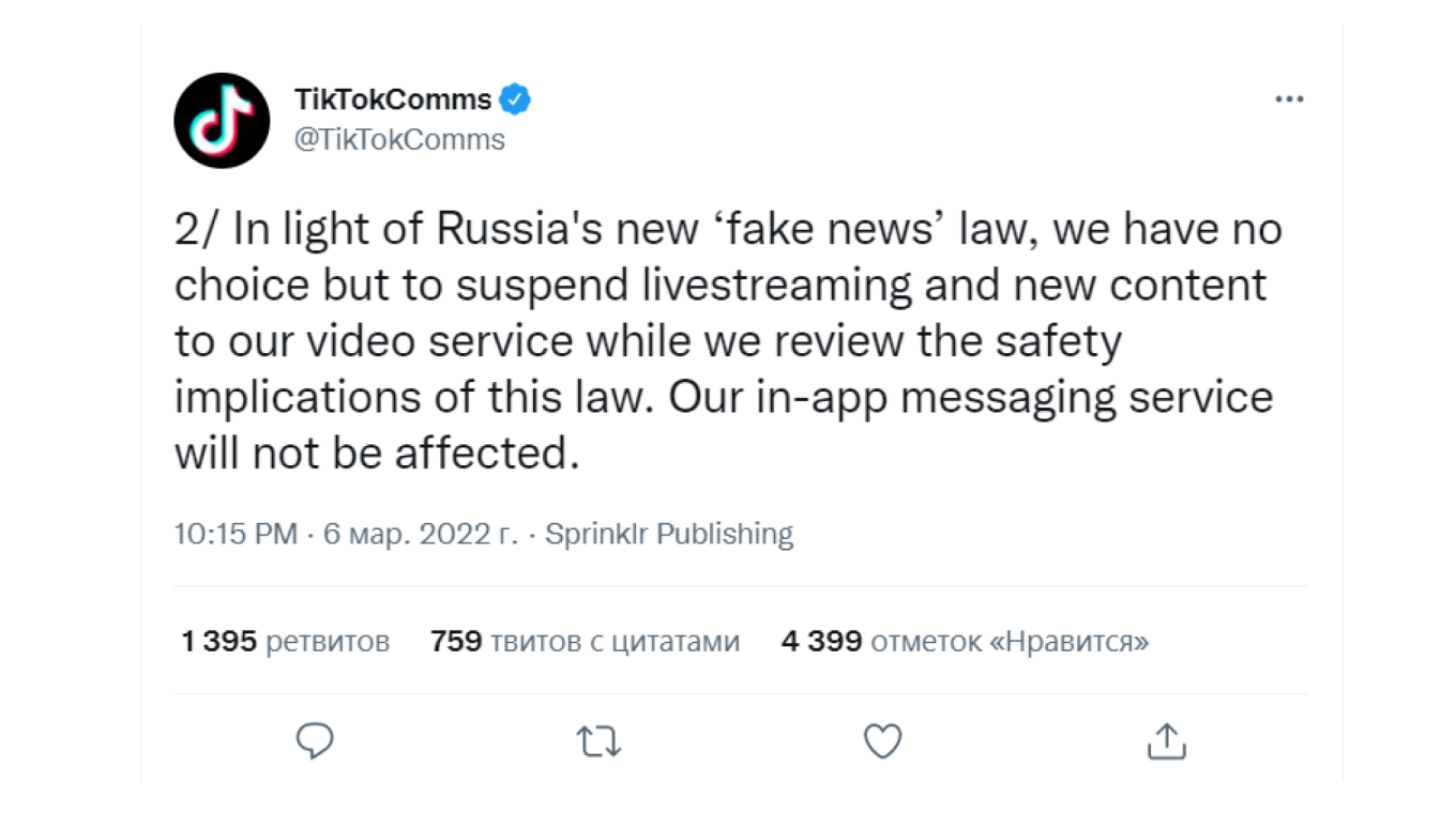 Кроме сообщения о приостановке работы в РФ, TikTok пообещал возобновить полноценную деятельность, как только это будет возможно