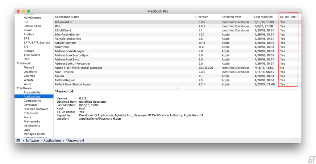 To check if you have 32-bit or 64-bit apps installed, open the Apple menu and select ‘About This Mac.’ Click ‘System Report,’ then on the left-hand menu click where it says ‘Applications’. There will be a column titled ’64-bit’. If the app is 64-bit, it will say ‘Yes’ in this column. If it says ‘No’, upgrade to the 64-bit version if possible, or consider an alternative app if there is not a 64-bit version available.