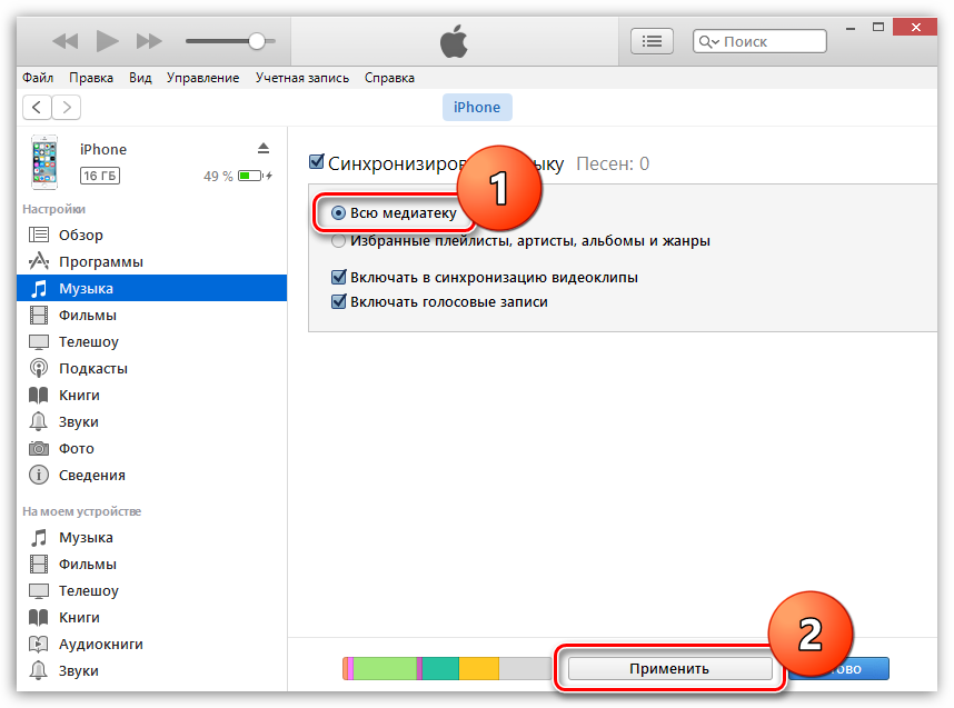 Здесь нужно выбрать вариант «Избранные плейлисты, артисты, альбомы и жанры». Используя эту опцию, вы сможете выбирать, какая музыка должна быть синхронизирована с Айфоном, а какая нет. Дальше нужно установить отметки напротив музыки, которую вы хотите оставить в памяти iPhone и нажать на кнопку «Синхронизировать». В результате Айтюнс синхронизует файлы на Айфоне и не отмеченная музыка будет удалена. Для того чтобы вернуть удаленную музыку назад на Айфон нужно просто выбрать опцию «Всю медиатеку» и нажать на кнопку «Применить».