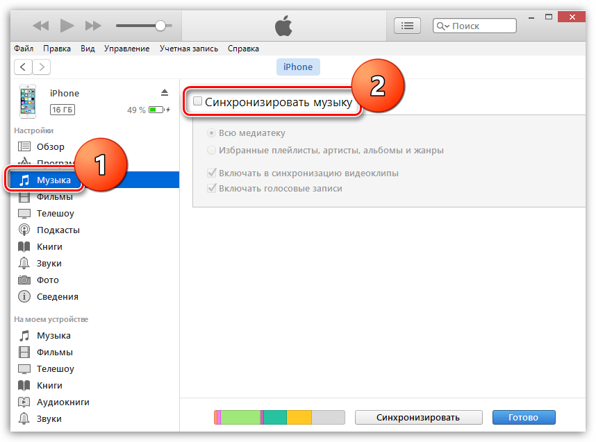 Теперь рассмотрим более сложные способы удаления музыки с iPhone, а именно удаление с помощью программы iTunes. Для начала покажем, как можно удалить музыку с Айфона, но при этом оставить ее в медиатеке Айтюнс. Данный способ очень удобен, если в будущем вы планируете загрузить музыку обратно на телефон.