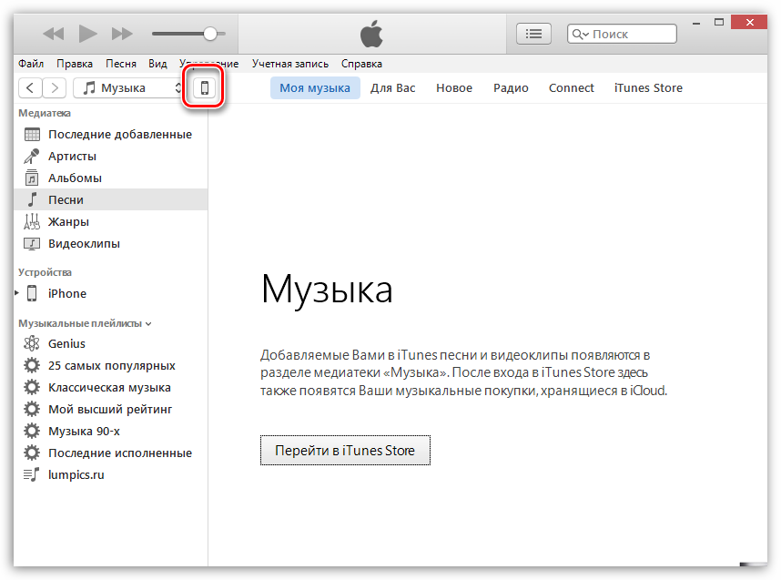 Подробнее: Как удалить музыку из iTunes После очистки медиатеки iTunes потребуется синхронизировать изменения с iPhone. Для этого щелкните по иконке устройства в верхней области окна, чтобы перейти в меню управления им.