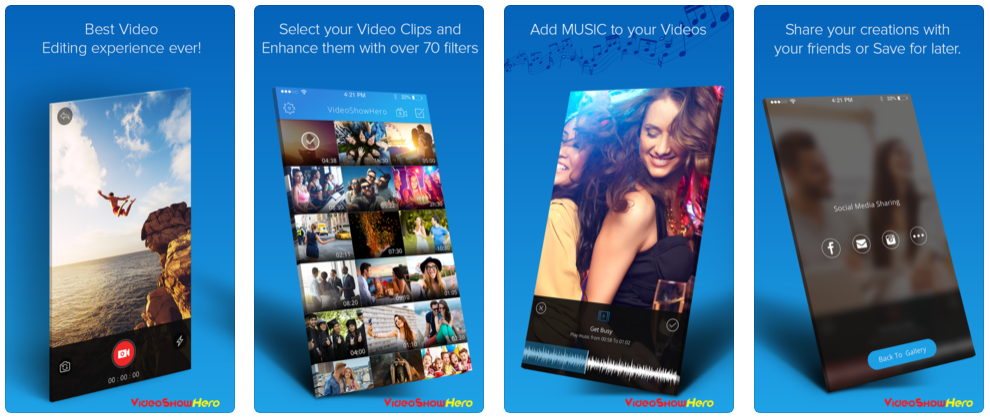 Приложение мало чем отличается от предыдущих. Оно также умеет изменять настройки клипа, накладывать фильтры, эффекты. VideoShowHero работает в связке с популярными социальными сетями и не только — Instagram, Musical.ly, и другими.