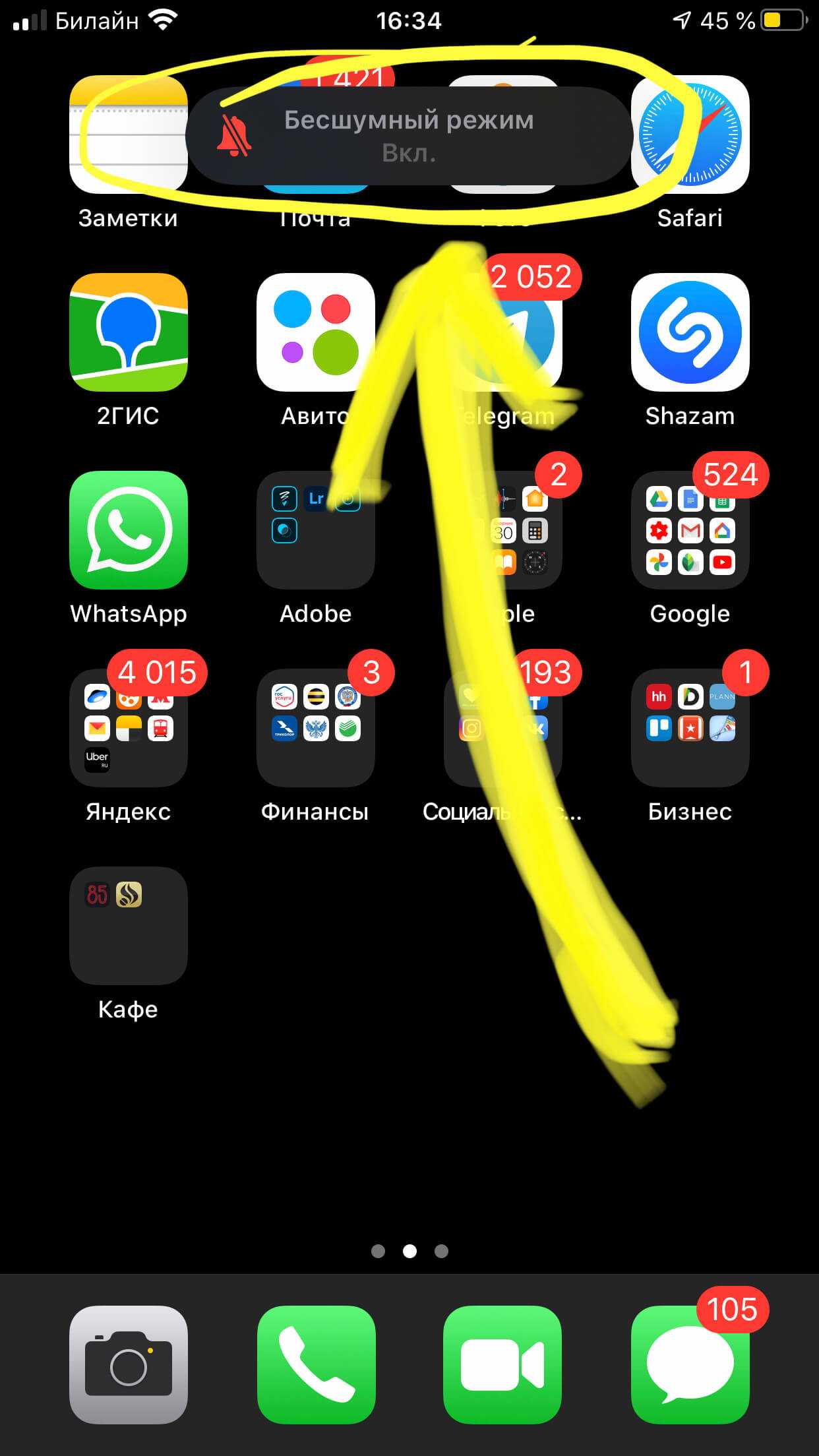 Находим кнопку-тумблер на левой грани девайса, переводим ее из верхней позиции в нижнюю (при этом вверху мы увидим красную полосочку — указатель беззвучного режима).