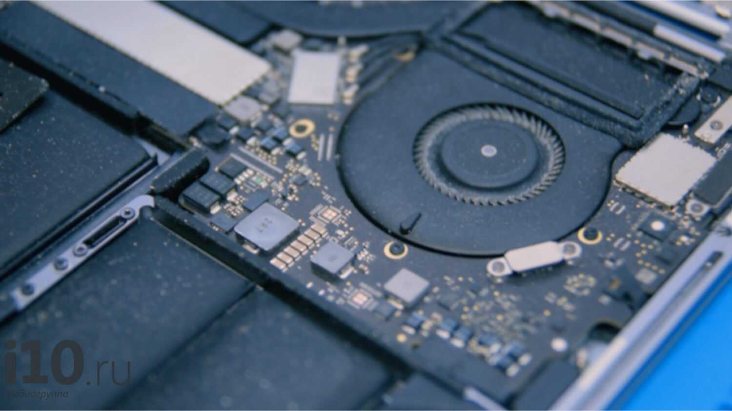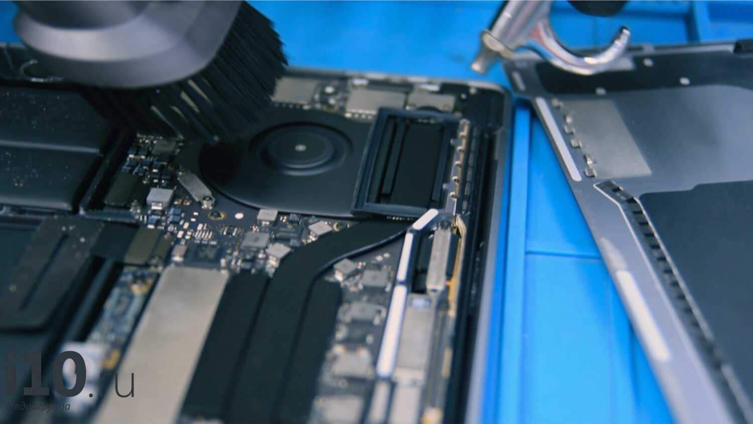 Теперь, когда макбук обесточен, выполняется чистка MacBook Pro с помощью щётки и сжатого воздуха. Разница видна сразу (посмотрите, на аккумуляторе ещё есть грязь, а сверху её уже убрали).