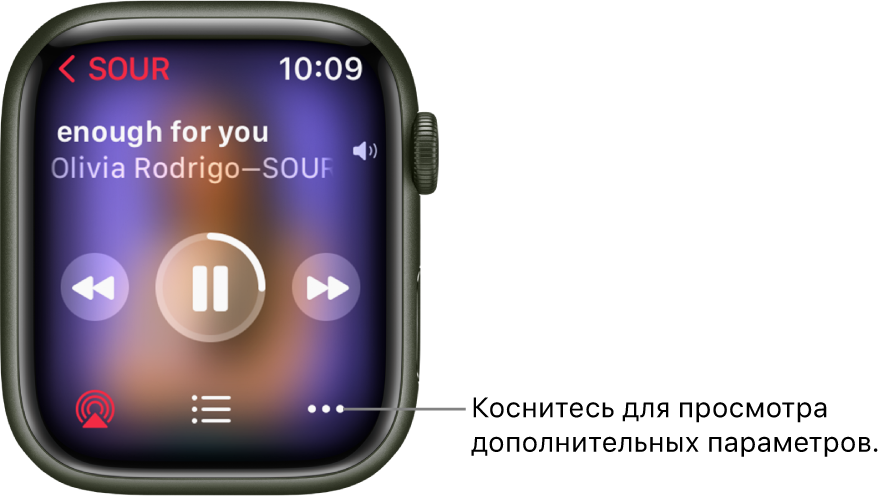Поверните колесико Digital Crown, чтобы отрегулировать уровень громкости. Используйте следующие элементы для управления воспроизведением музыки на Apple Watch и iPhone: