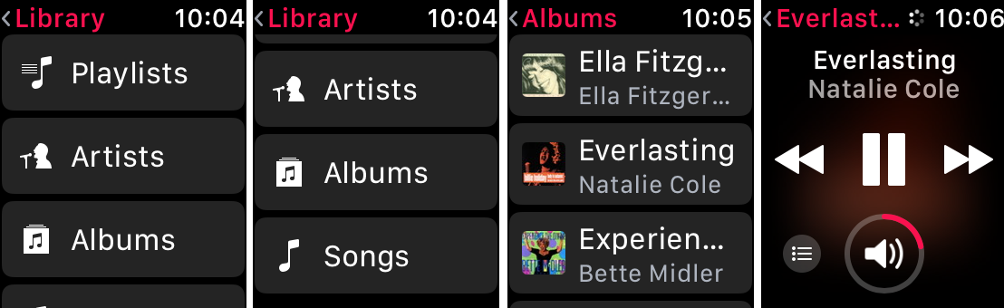 - Проведите пальцем вверх или вниз, чтобы прокрутить музыку или используйте “Digital Crown.” Коснитесь альбома или плейлиста, чтобы прослушать его.