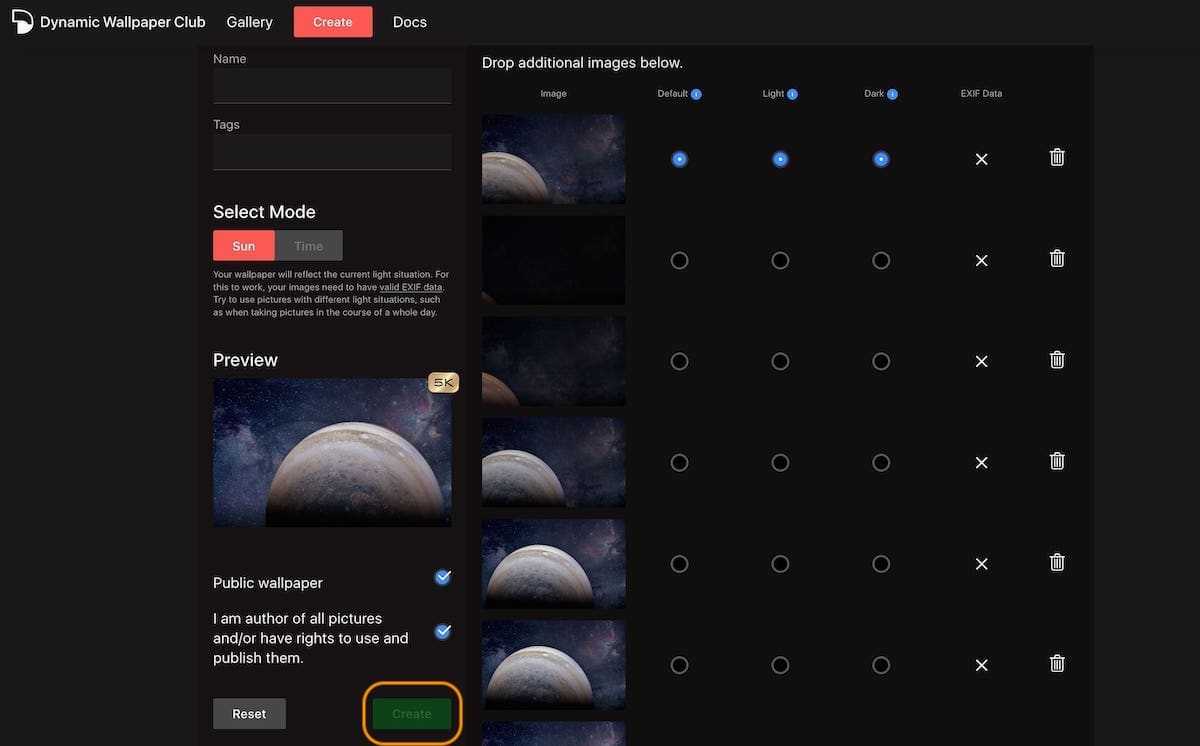 Так что просто нажмите на ссылку ниже, чтобы перейти на сайт, и нажмите кнопку «Создать». Теперь загрузите свои изображения, дайте ему имя и установите настройки. Наконец, нажмите кнопку «Создать». Здесь стоит отметить две вещи. Во-первых, вам понадобится минимум три фотографии для создания динамических обоев. Во-вторых, веб-сайт принимает только PNG и JPEG как допустимые форматы изображений.