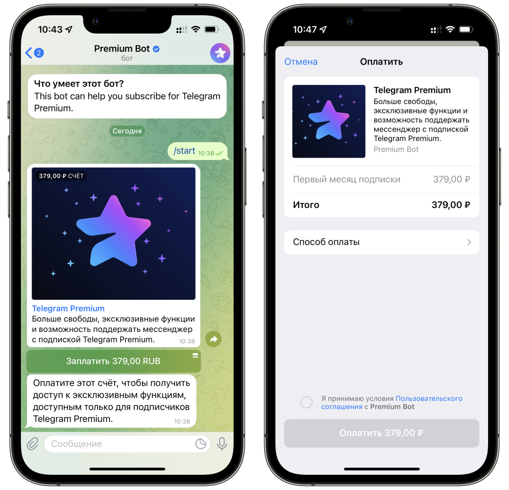 Чтобы сэкономить и не использовать Apple ID, юзеры могут обратиться к официальному боту @PremiumBot. Он позволяет оплатить подписку прямо через приложение, введя реквизиты. В таком случае расширенный аккаунт обойдется всего в 379 рублей в месяц.