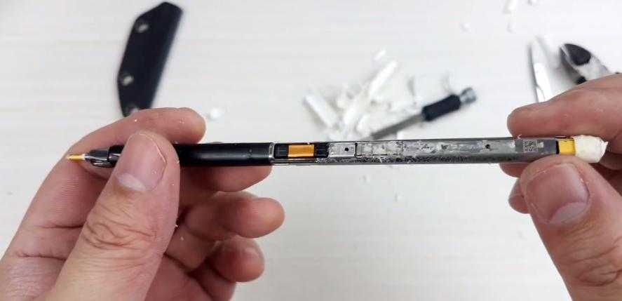 Карандаш (Apple Pencil) представляет из себя цельный корпус, и единственный вариант добраться до начинки — это уничтожить его пластиковую часть, под которой находится еще и металлическая оболочка.