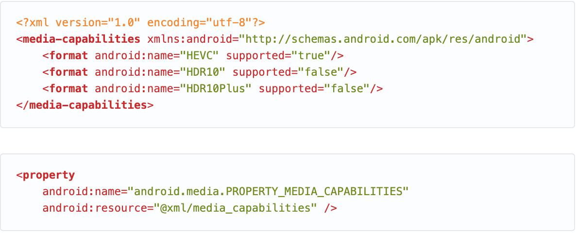 In Android 12, the ability for any application to play modern video formats appears. Android will be able to convert HEVC (H.265) to AVC (H.264) as well as HDR10 to SDR. You need to create a new XML file in your application resources describing support for modern formats, and then add a link to it in the AndroidManifest.