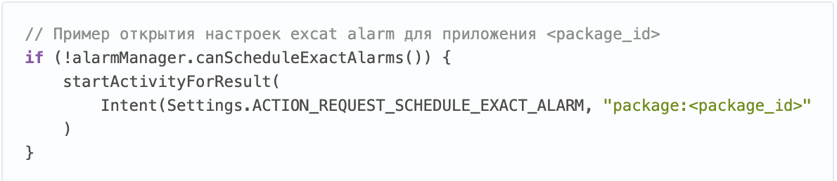 В Android 12 появляется новое разрешение: schedule exact alarm. Без его получения теперь невозможно будет создать alarm в AlarmManager’е. Если такое разрешение не получить заранее, то будет выбрасываться SecurityException. При этом приложения должны использовать новые алармы только если это является критическим функционалом. Например, если это будильники или таймеры. А также приложение, которое содержит функционал с требованием, будет вызываться в точное время.