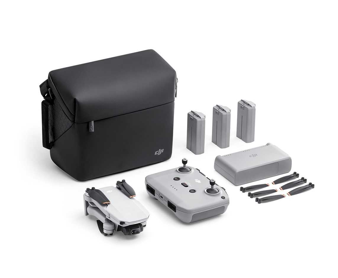 - DJI Mini 2 Fly More Combo (В комплекте: Дрон/Пульт/3 × АКБ/6 × зап. пропеллеров/Зарядный кабель/3 × RC-кабеля/18Вт ЗУЗУ для одновременной последовательной зарядки трёх АКБ/Фиксатор пропеллеров/Запасной крепёж для пропеллеров/Отвёртка/Инструкция пользователя/Транспортировочная сумка)