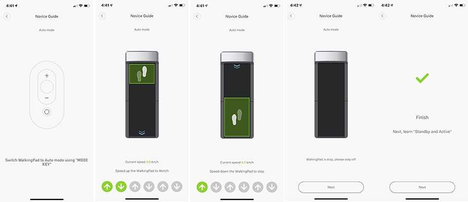 Для того чтобы начать тренировку, нужно выбрать режим через пульт, боковой кнопкой на тренажере или в приложении: «М» — ручной, скорость задается через пульт или «А» — автоматический. Необходимо встать на середину дорожки, начнется обратный отчет и дорожка начнет двигаться, показывая свой статус на основном экране (скорость, пройденная дистанция, количество шагов; что именно отображать можно выбрать в приложении).