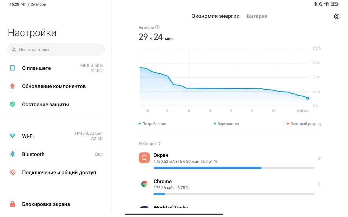 Очень быстрой такую зарядку, конечно, не назовешь и полностью устройство заряжается примерно 2 часа. Хотя для аккумулятора такого объема это вполне нормальный показатель, как по мне. Плюс по информации из сети, 33 Вт адаптер заряжает планшет быстрее приблизительно на 20 минут. Ниже — подробные замеры скорости восполнения заряда аккумулятора от стандартного комплектного 22,5 Вт адаптера с 8% до 100%: