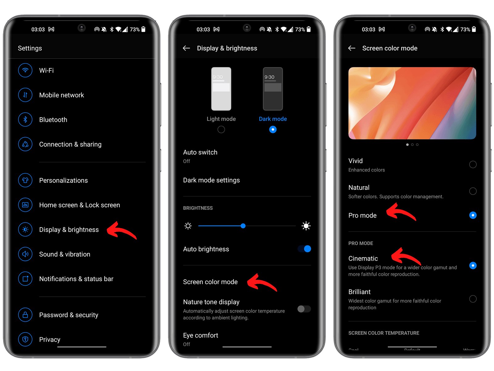 Экраны смартфонов OnePlus отлично откалиброваны и предлагают несколько цветовых режимов. Для натурального отображения вместо яркого режима можно поставить режим «Естественный цвет». Ещё OnePlus предлагает профессиональный кинематографический режим, который максимально охватывает цветовой диапазон DCI-P3 для обеспечения более широкой палитры цветов и точной цветопередачи.