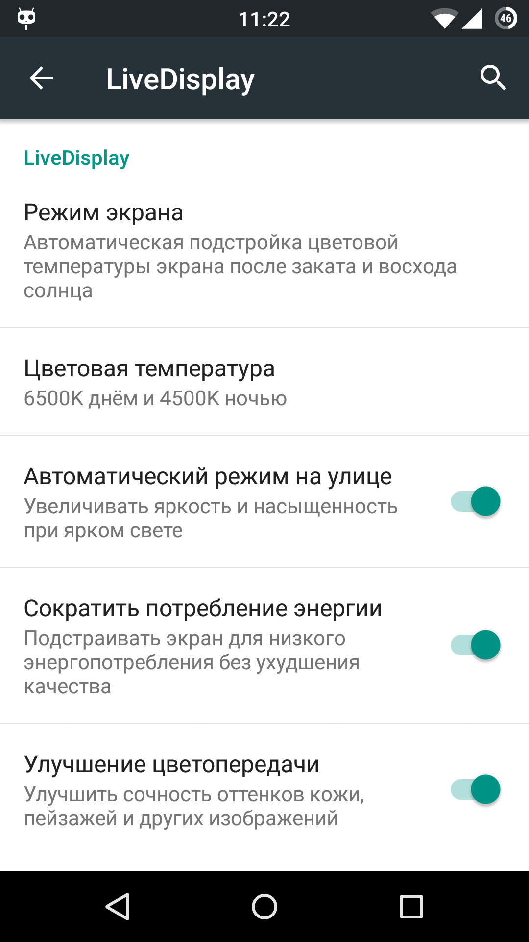 CyanogenMod использует интеллектуальный адаптивный механизм управления настройками экрана. Автоматически регулируется не только яркость экрана, но и цветовая температура. Это значит, что вечером, когда солнце зайдет за горизонт, система перейдет на использование более теплых оттенков — так глаза меньше устают. Более того, система умеет изменять насыщенность цветов при ярком свете и использует специальные алгоритмы для лучшего отображения фотографий и изображений.