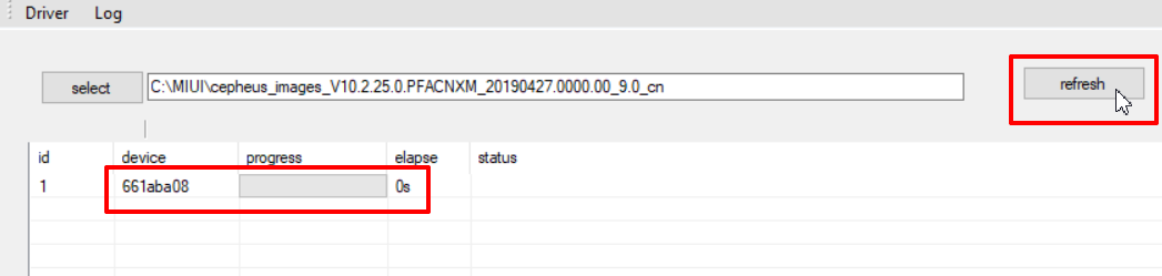 - В программе Mi Flash нажимаем на кнопку «Refresh», после чего в окне должно определиться устройство.