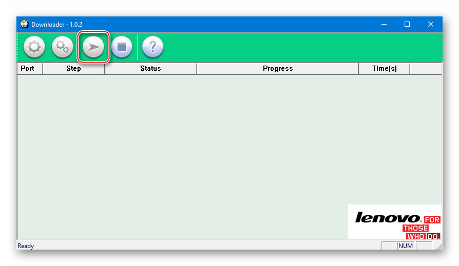 Теперь запускаем программу Downloader. В открывшемся окне нужно нажать на значок с одной шестерёнкой. Он откроет проводник, посредством которого нужно указать путь к папке с прошивочным файлом. После этого нужно нажать на кнопку со стрелочкой.
