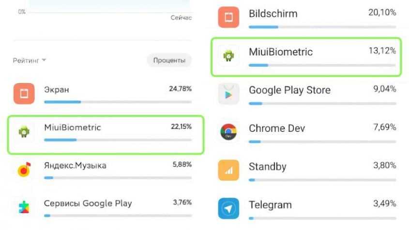 - Он может активно потреблять батарею (у некоторых пользователей доходит до 75%). По факту, энергию потребляет приложение записи экрана, которое нужно компоненту MIUI Biometric, чтобы получать данные с экрана телефона. Сделать с этим ничего нельзя, потому как полностью удалять компонент биометрии не имеет смысла.