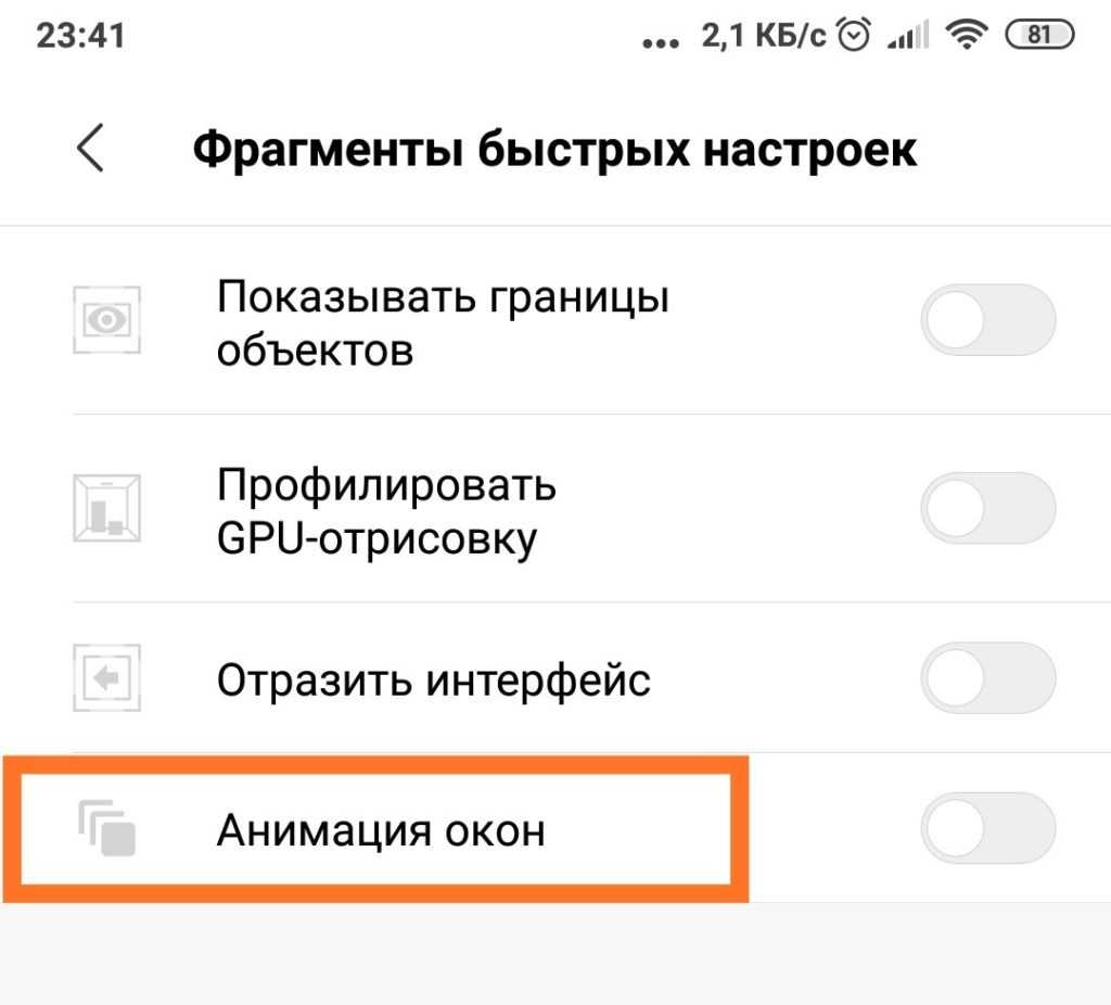 В брендовой оболочке от Xiaomi в параметры от производителя всегда включена анимация интерфейса. Она смотрится стильно, но может дополнительно загрузить систему. Это будет особенно заметно, если у вас модель со слабыми характеристиками.