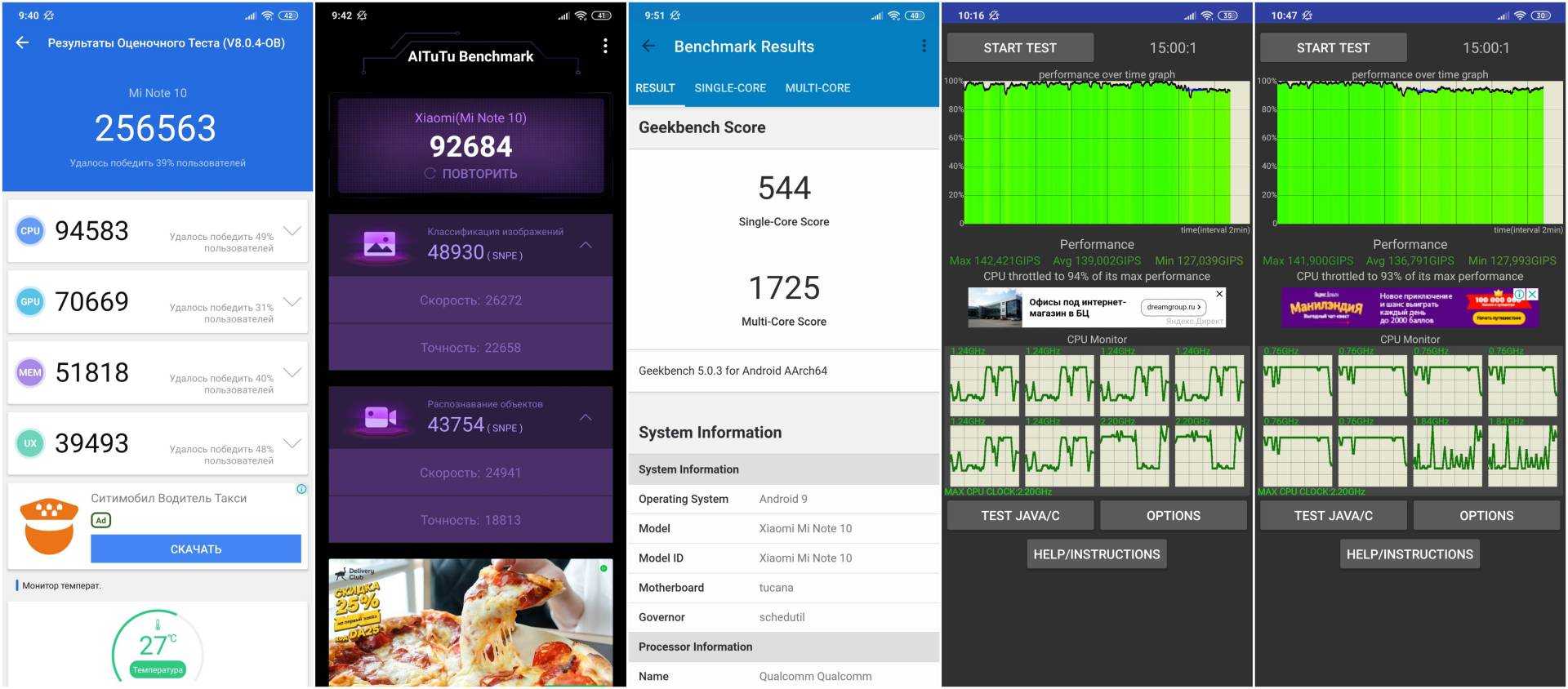 В Mi Note 10 Pro установлен дешёвый и злой 8-ядерный чипсет Qualcomm Snapdragon 730G, выполненный по технологии 8 нм. За обработку графики отвечает чип Adreno 618, работающий на частоте 700 МГц. Ёмкость LPDDR4X оперативной памяти составляет 8 ГБ, а внутренней – 256 ГБ. Возможности расширения не предусмотрено. Большую часть времени интерфейс работает нормально, подёргивания случаются, но редко. Возможно, ситуация улучшится, если отключить весь программный Mi-мусор. Тест на троттлинг выявил дропы частоты процессора до ~78%, однако, после добавления тестового приложения в список «Ускорение игр», девайс показывает завидную стабильность. Четырёхкратный прогон AnTuTu в этом режиме только закрепил этот факт. Другое дело, что при длительных нагрузках нагревается металлическая рамка, из-за чего пользоваться телефоном без чехла становится дискомфортно.