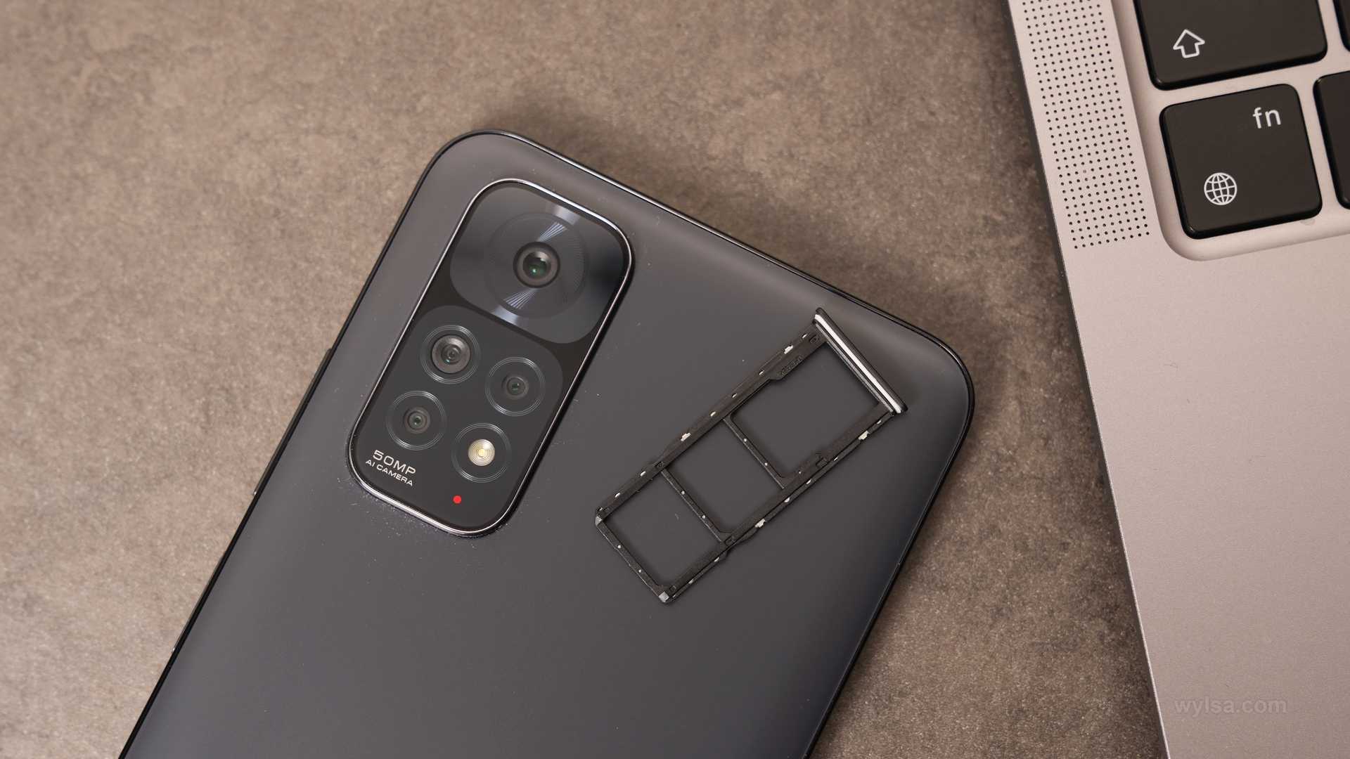 Дисплей Xiaomi Redmi Note 11S плоский и защищён стеклом Gorilla Glass 3. Задняя крышка сделана из стекла AG, которое закруглено по сторонам, а боковые рамки пластиковые. У корпуса есть защита от пыли и брызг IP53 – гаджет можно без опасений использовать во время дождя, но не более. Слот для SIM-карт защищён резиновой заглушкой.