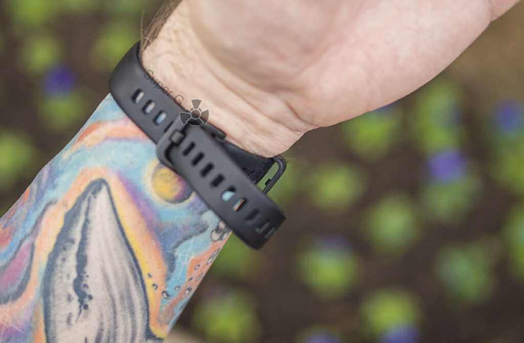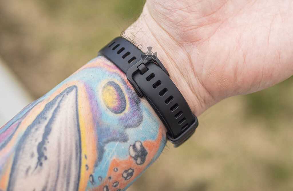 Кстати, застёжка ремешка у HUAWEI чуть надежнее. Хвостик фиксируется металлической пряжкой с язычком, а чтобы кончик не болтался без дела, дополнительно зажимается стопорным кольцом с зубчиком внутри. Зацепить о рукав одежды и расстегнуть ремешок, как это часто случается с Xiaomi, попросту невозможно.