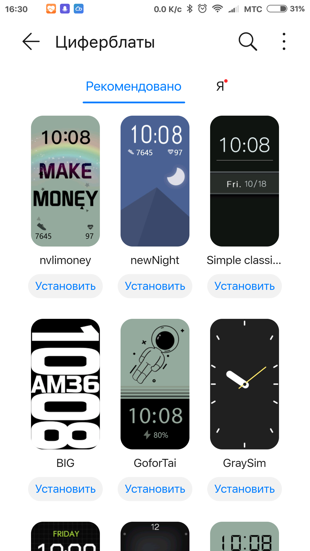 Пользователь может выбрать 14 вариантов отображения циферблатов, от классики до современного стиля. Есть необычные варианты в виде картинок или шкалы с показаниями не только времени, пройденной дистанции, но и пульса. Через мобильное приложение Huawei Health можно загружать и устанавливать большее количество циферблатов. Часть их них бесплатные, а другие – платные. Для загрузки необходима учётная запись Huawei AppGallery.