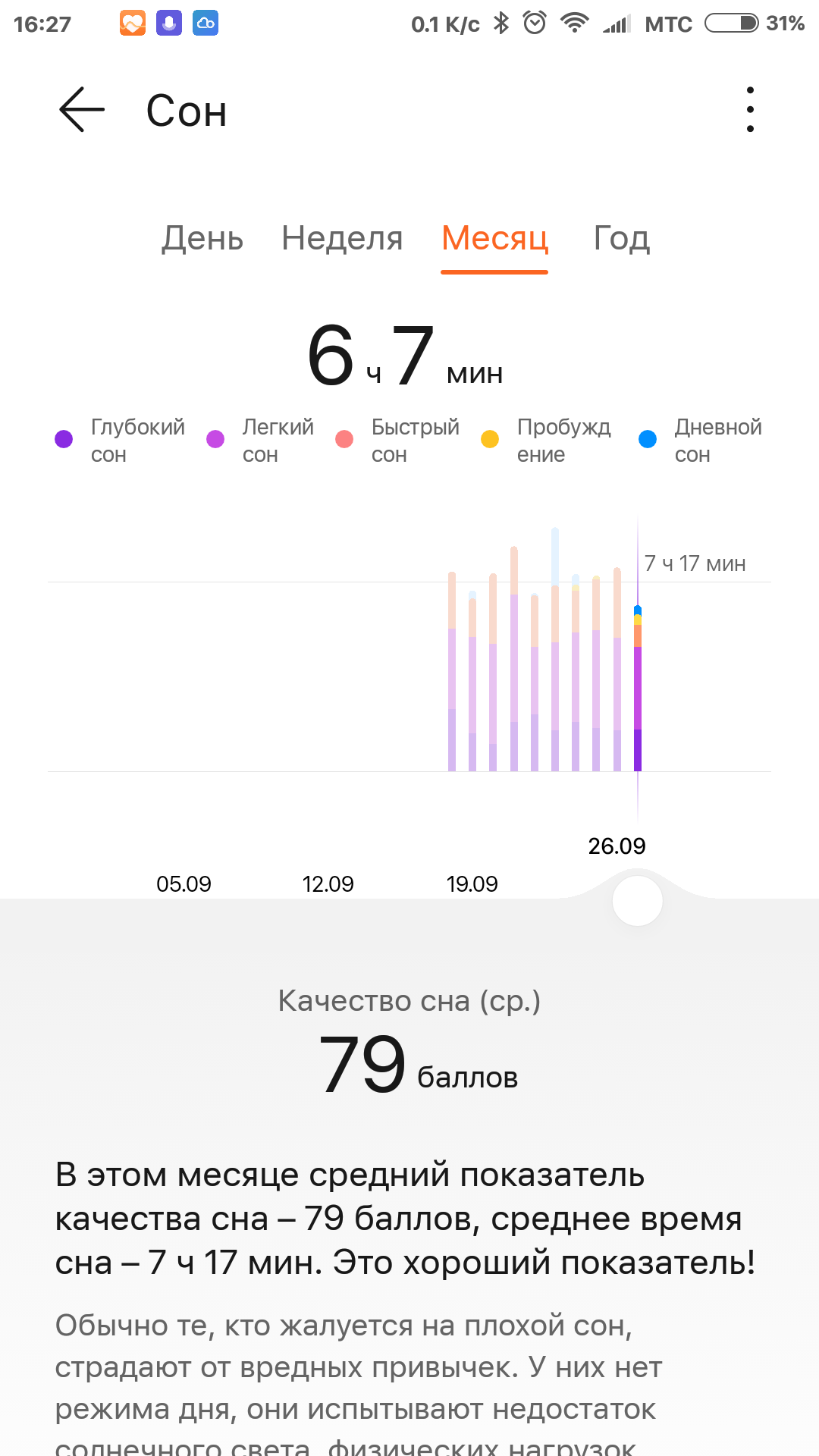 Что удобно, все показатели можно отсматривать в разных временных рамках. Например, легко посмотреть, сколько в среднем вы спали за сутки в прошлом месяце или даже году и сравнить с текущим уровнем. Таким образом, браслет поможет скорректировать график и вести более здоровый образ жизни, следя за своими привычками и соблюдая необходимую активность.