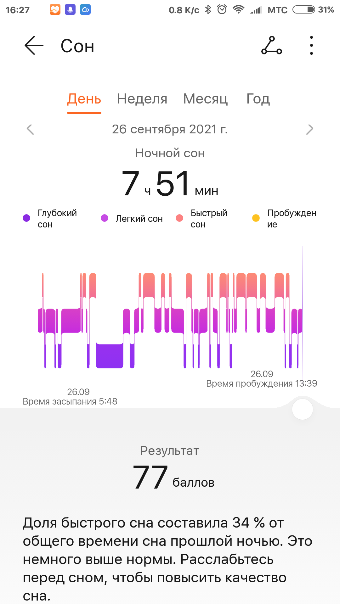 Так Mi Band 6 умеет высчитывать коэффициент PAI, который одним числом наглядно показывает вашу активность за последние 7 дней. Если за прошедшие 7 дней вы набрали 100 баллов или выше, ваша активность достаточна для того, чтобы поддерживать хороший уровень общего самочувствия и здоровья. Если ниже – следует увеличить активность.
