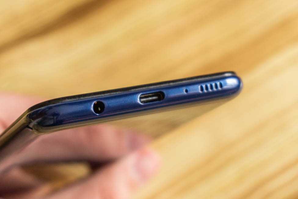 Снизу собрались все остальные элементы — 3,5-мм аудиоразъем, неожиданно порт USB Type-C, микрофон и пять прорезей с мультимедийным динамиком. И за что просто невозможно не нахваливать — так это за USB-C. Да, процесс перехода на новый порт в бюджетниках затянулся, но всё-таки он идет и меня радует, что в Samsung его не игнорируют.