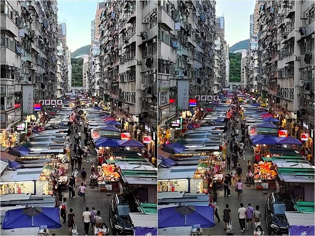 ….unless you blow these images up to full size on a large monitor. For example, let’s take a closer look at the first set of samples, of a bustling street market in Hong Kong. The below collage are 100% crops of each image.