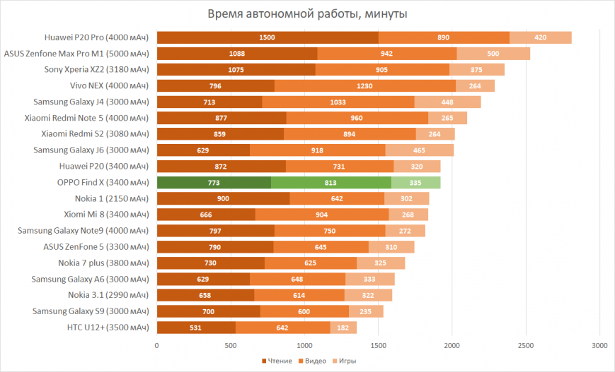 Если первая главная фишка OPPO Find X — это выдвижные камеры, то вторая — быстрая зарядка. Сам по себе аккумулятор в смартфоне стоит совсем не выдающийся — 12,9 Вт·ч (3400 мА·ч, 3,8 В). Даже с учетом OLED-матрицы и энергоэффективной платформы рассчитывать на полный день от зарядки не стоит. Поднялись в восемь утра? Значит, уже к 18-19 стоит подыскивать розетку. Зато экран на органических светодиодах дает отличный бонус в случае простого просмотра видео. Ниже на нашем графике можно увидеть, что в традиционном тесте с воспроизведением HD-видео на максимальной яркости, при включенном беспроводном соединении, с действующими обновлениями, OPPO Find X продержался без малого 14 часов. Вполне ожидаемый результат.