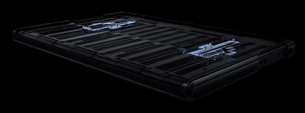 Сам же экран закреплен на подушке в форме гребешка. В сложенном виде поддерживается вся поверхность, в разложенном — жесткость дополнительно обеспечивают усиливающие элементы дисплея.