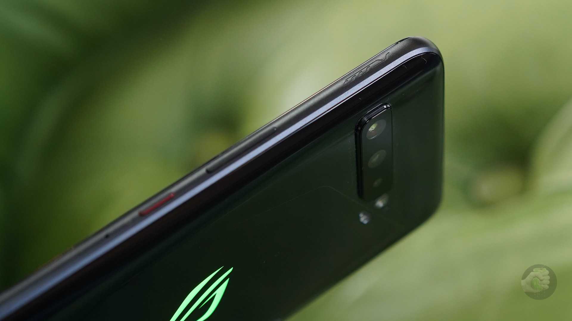 В остальном всё знакомо. Блок камер небольшого размера, немного выпирает из корпуса. На правом торце расположены кнопка включения и качелька громкости, на левом — порт для подключения вентилятора и USB Type-C, которые прикрыты резиновой вставкой. Также слева расположен лоток на две SIM-карты, флешку вставить нельзя. Снизу расположились разъем 3,5 мм и еще один Type-C. Отметим, что боковой порт USB Type-C нужен, чтобы при подключенной зарядке торчащий провод не мешал играть.