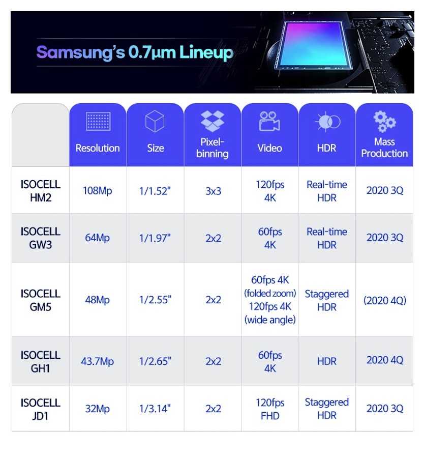 Разница в 0,1 микрометра позволила уменьшить высоту модуля камеры сразу на 10% по сравнению с 0,8-мкм решениями. Вся линейка датчиков изготовлена с использованием технологий ISOCELL Plus и Smart-ISO, благодаря чему их светочувствительность возросла на 12% сравнительно с моделями предыдущего поколения. Кроме того, разработчиками был улучшен алгоритм замера экспозиции.