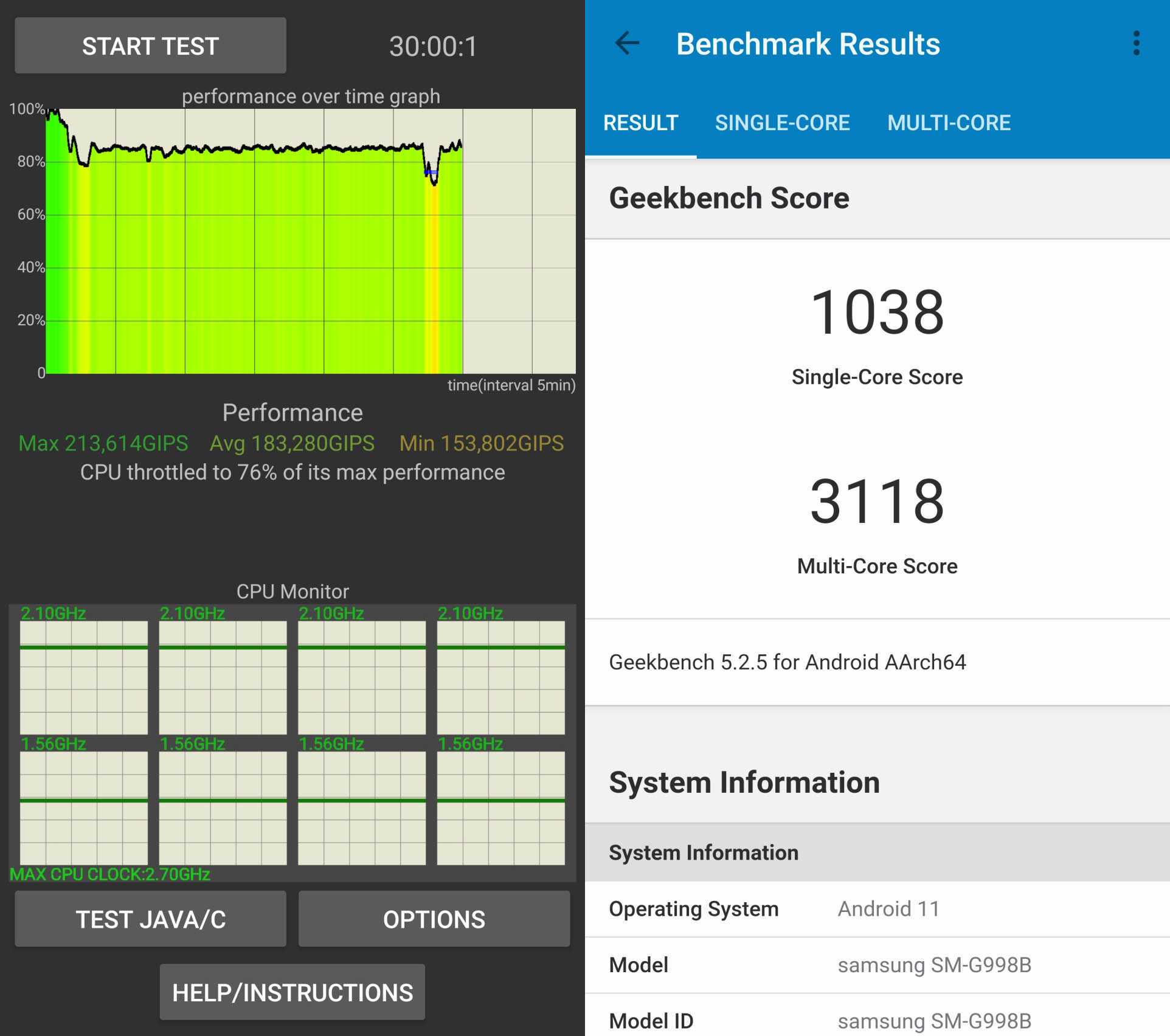 Samsung проделала огромную работу по разработке нового Exynos 2100: в сравнении с прошлогодним Exynos 990 производительность увеличилась на 10 %, энергоэффективность — на 20 %, графика Arm Mali-G78 мощнее на 40 % графического процессора, который был установлен в 990-й «Эксинос». Я не заметил проблем с производительностью, её хватало на всё: смартфон отлично работает в высоком разрешении экрана с повышенной плавностью отображения интерфейса, фризов не было, приложения из памяти не выгружались, а нагреть смартфон оказалось практически непосильной задачей.