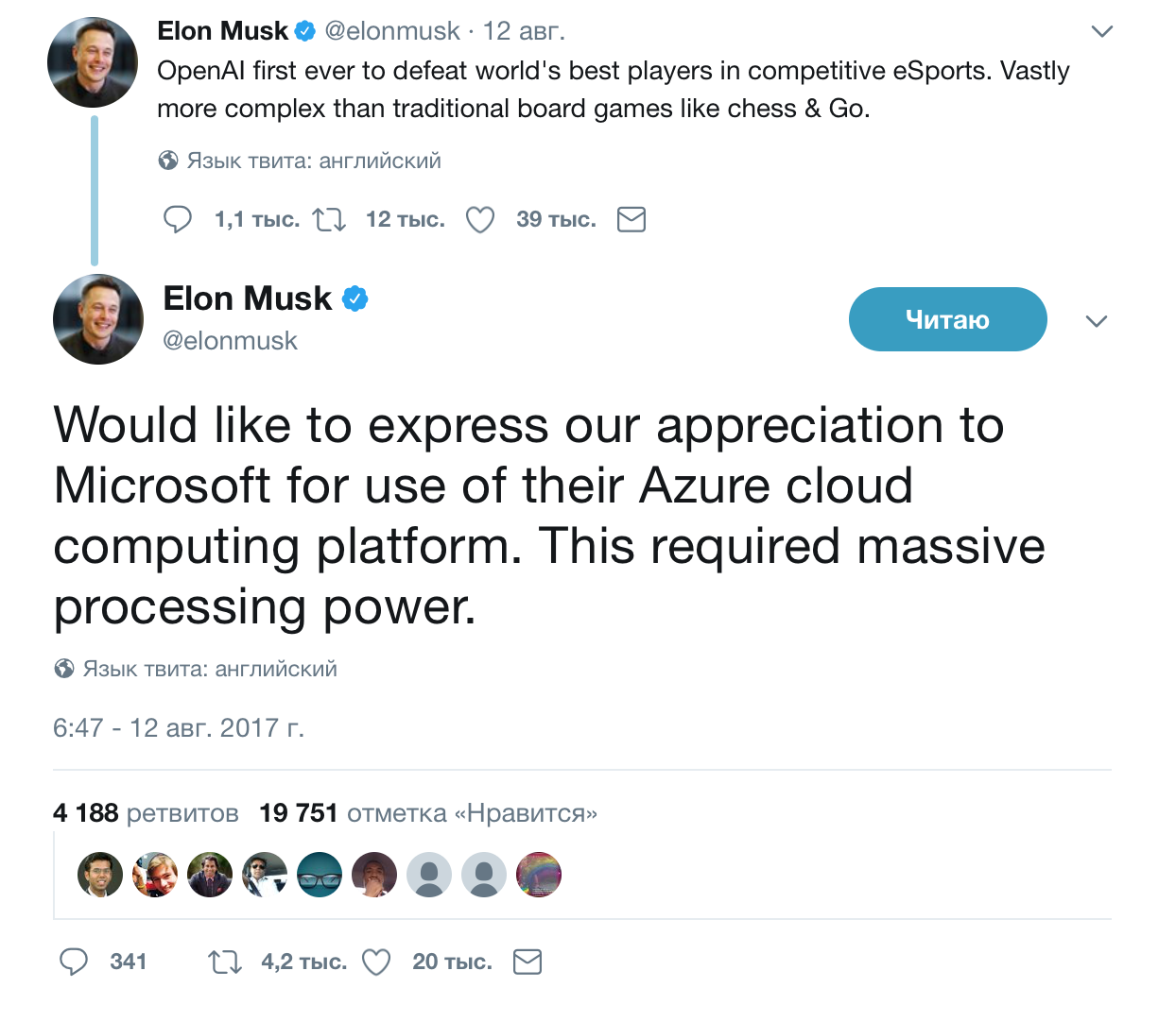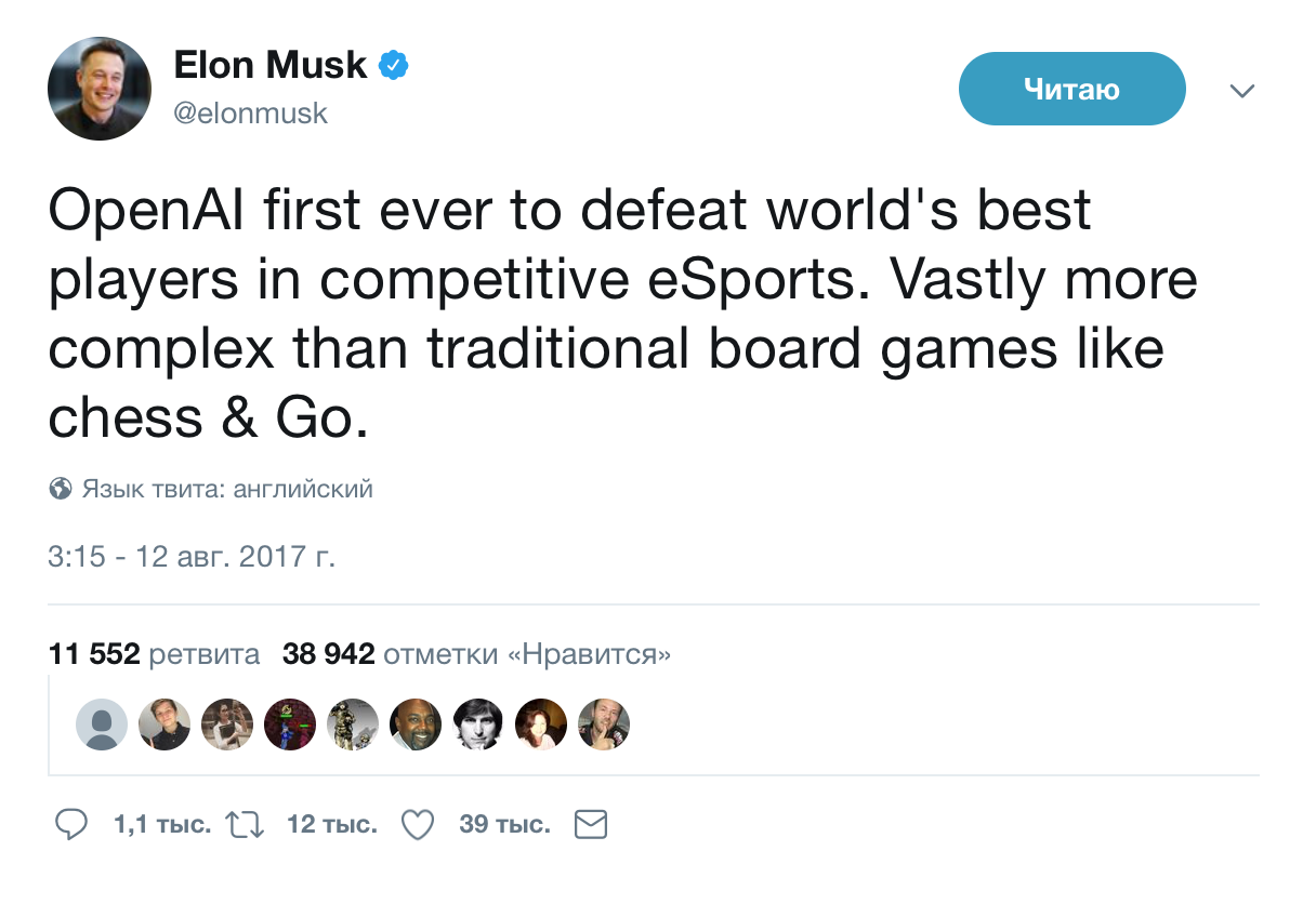 Спустя секунды после победы бота от Open AI Илон Маск написал в твиттере, что бот организация, инициатором которой стал сам Илон, победила в намного более сложной игре, чем шахматы или го: