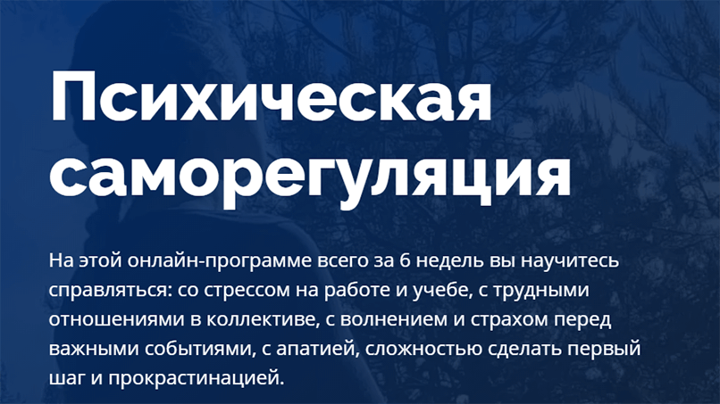Описание. Курс психической саморегуляции помогает избавляться от любых негативных переживаний, настраиваться на позитив. Осваивать его вы будете в течение шести недель, за это время пройдете 25 уроков. Каждый урок длится 25-30 минут, проходить занятия быстрее, чем заявлено в расписании, нельзя. Это сделано намеренно – чтобы ваш мозг переваривал всю полученную информацию за время перерывов.