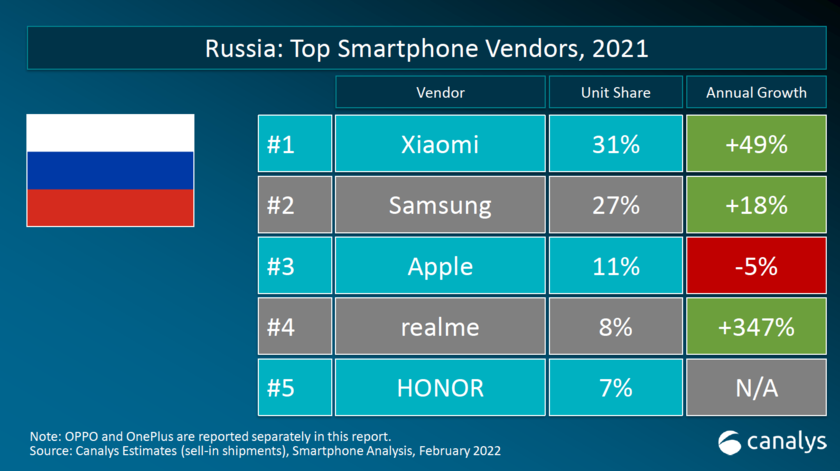 По данным Canalys, Xiaomi заняла первое место по поставкам смартфонов на российский рынок в штуках в 2021 году. Доля поставок Xiaomi составила 31% и показала 49% рост по сравнению с предыдущим годом.