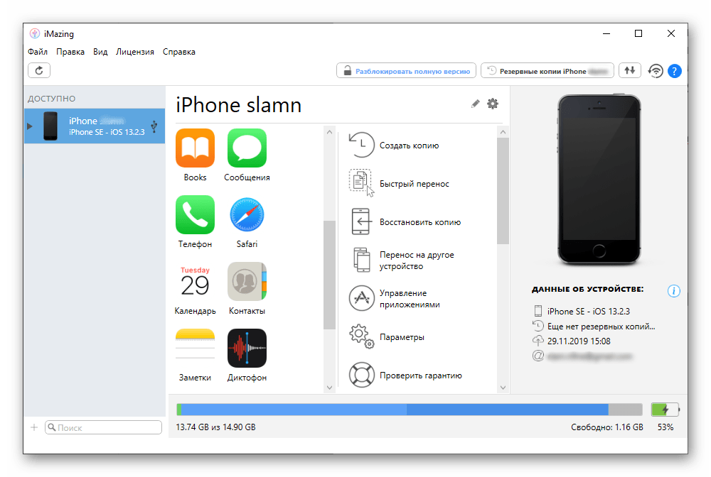 По сравнению с предыдущим вариантом, который обычно применяется в качестве средства для закачки контента, iMazing наделён более широким функционалом. При первом же подключении пользователь может увидеть подробную информацию о мобильном устройстве, в частности, состояние памяти, текущий заряд аккумулятора, а также другие моменты, которых нет даже в iTunes.