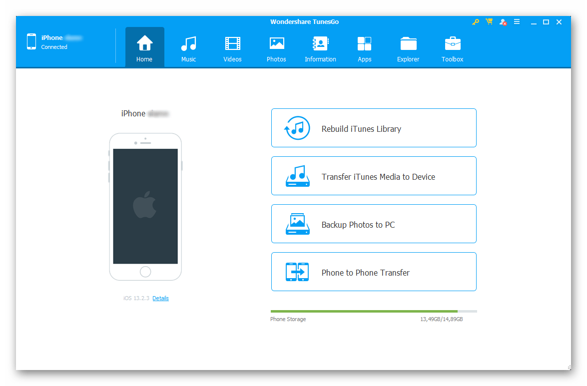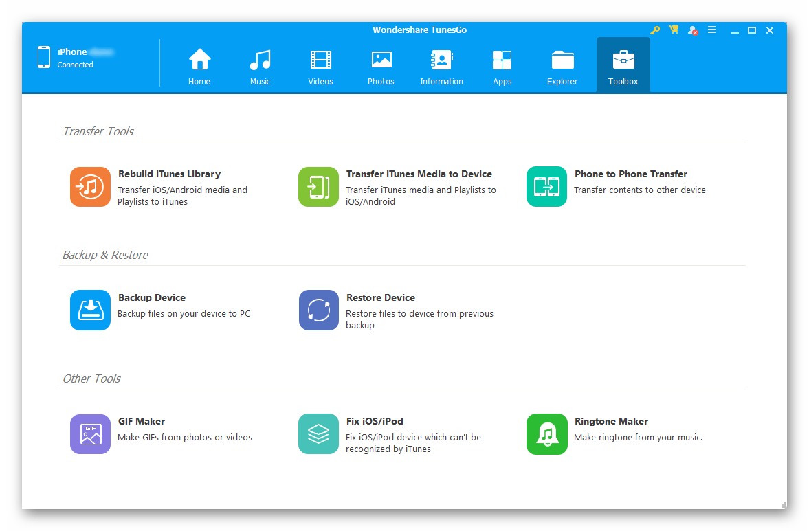 В Wondershare TunesGo есть набор утилит, решающих разного рода задачи. В числе таковых восстановление библиотеки iTunes, возможность создания резервных копий и отката к таковым, инструмент для переноса данных, приложения для создания GIF и рингтонов. Уникальной особенностью является средство для исправления ошибок в работе iOS на iPhone и iPad. Недостатки программы очевидны и их можно заметить даже по скриншотам – интерфейс выполнен на английском языке, а для получения доступа ко всем функциям нужно приобрести полную версию.
