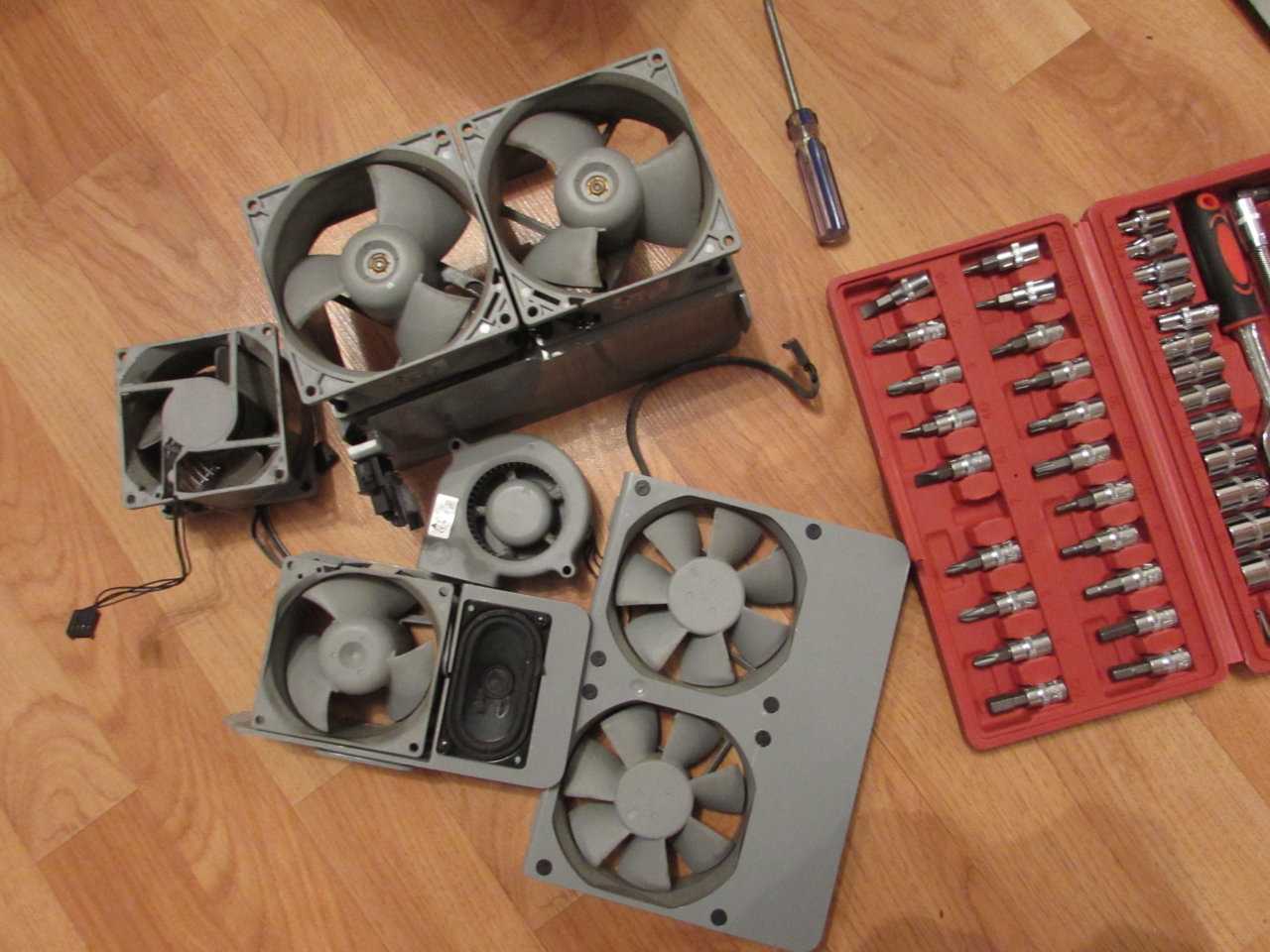 Первым этапом в деле строительства хакинтоша стал варварский демонтаж потрохов Apple Power Mac из фирменного корпуса. Дефектная материнская плата отправилась на помойку, за ней последовал блок питания, который в этой машине очень компактно расположен в нижней части кейса. Оба процессора, система охлаждения, видяха и прочий исправный ливер были выставлены за копейки на доске объявлений и со свистом улетели к новым владельцам буквально на следующий день. Огромная куча вентиляторов, которыми был оборудован G5, заполнила отдельный мусорный пакет.